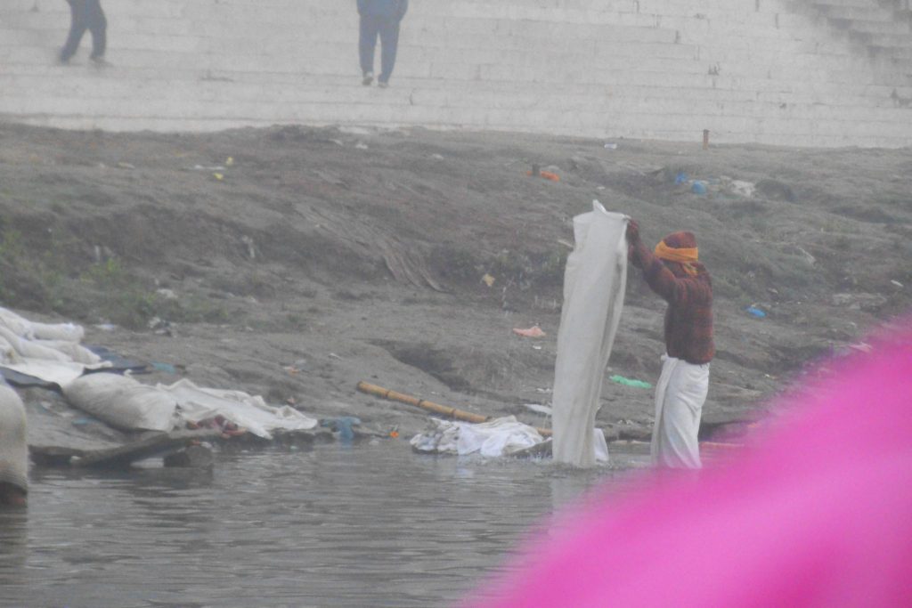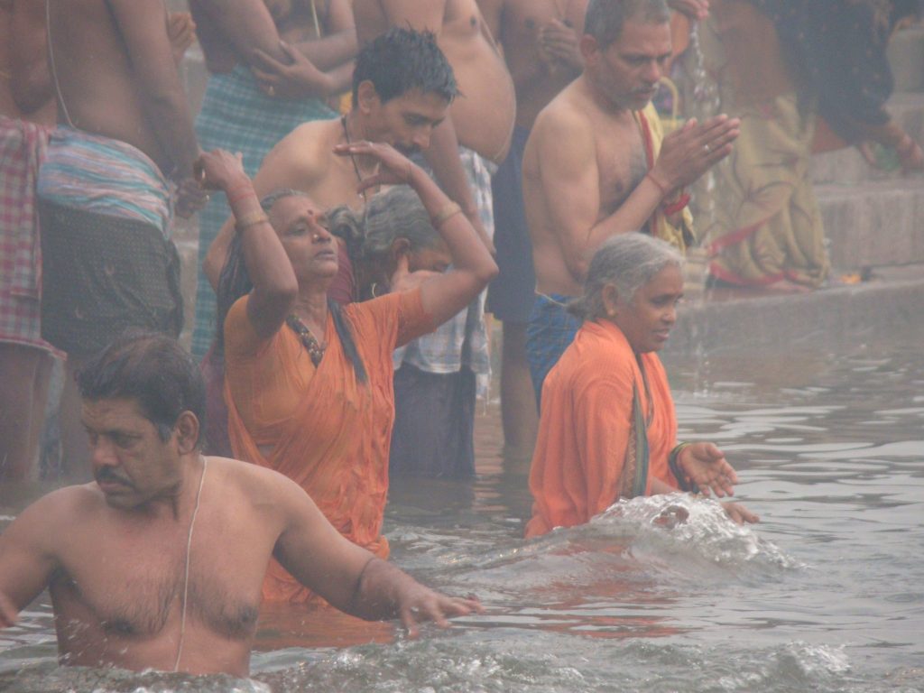 Najwięcej osób przychodzących o świcie nad rzekę oddaje się rytualnemu oczyszczeniu – pudża. Kąpiel należy brać w 5 miejscach w określonej kolejności i to w ciągu jednego dnia. Można dostrzec mężczyzn i kobiety niosących ze sobą ręczniczek, płyn do kąpieli czy mydło.Inni schodzą po stopniach do wody i rozpoczynają rytuał oczyszczenia z grzechów. Dokładnie się przy tym myją, opłukują i często zanurzają pod wodę. Nieopodal pływają stery śmieci, zwierzęta piją wodę a nierzadko pływają ich zwłoki. Święta rzeka jest dla każdego – za życia i śmierci. Wg hinduizmu każdy wyznawca powinien raz w życiu dokonać rytualnej kąpieli w Gangesie.