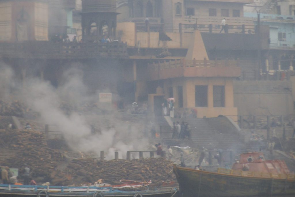 W tym czasie syn lub inna osoba z rodziny idzie do świątyni, odmawia ostatnią modlitwę za zmarłego po czym wraca i okrąża stos 5 razy ( co symbolizuje 4 żywioły i duszę) powtarzając mantrę. Do tego momentu w uroczystościach mogą brać udział kobiety. Zwyczajowo nie jest przyjęty płacz i rozpaczanie po zmarłym. Śmierć w hinduizmie jest drogą do odrodzenia, krótkim przystankiem między reinkarnacjami. A następne wcielenie może być lepsze i z tego trzeba się cieszyć! Po skończonym rytuale stos zostaje podpalony, może dokonać tego najstarszy syn, ale zazwyczaj zajmuje się tym ktoś z rodziny podpalaczy stosów, mieszkającej przy danym burning ghat. Ich zadaniem jest dbać o całą ceremonie i ogień. Ciało ludzkie spala się w przeciągu 3-4 godzin i nie ulega całkowitemu spopieleniu. Najczęściej pozostają miednica u kobiet i piszczele u mężczyzn . Pomimo to szczątki zostają zepchnięte do Gangesu. Ghaty płona przez 24 h/dobę. Spala się tu dziennie około 70 ciał…