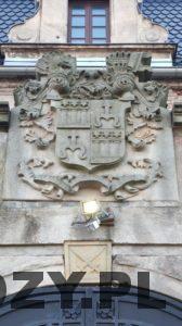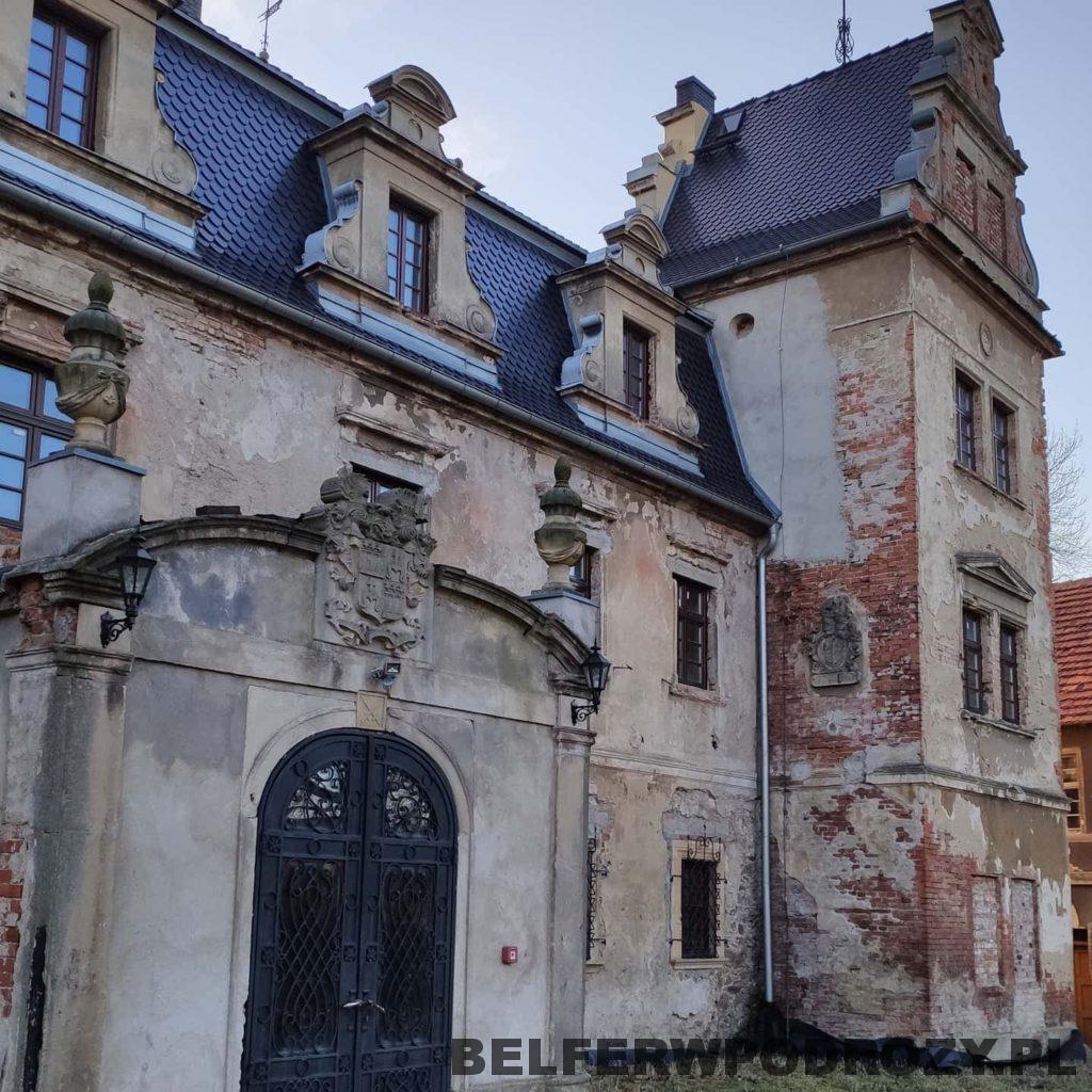 Pałac, początkowo jako dwór, powstał w XVI wieku, a obecny kształt pałacowy nabył po przebudowie dwa wieki później. Nadano mu wówczas cechy barokowe, dzisiaj możemy je dostrzec w części frontowej. Nad wejściem do ganku, w dwóch narożnikach znajdują się wazony, a pomiędzy nimi widnieje kartusz herbowy rodziny von Perponcher – Sedlnitzky, którzy to byli właścicielami pałacu od połowy XIX wieku. To, że możemy dzisiaj podziwiać ten niezwykły kartusz to prawdziwe szczęście. W XX wieku, kiedy to dochodziło do największej dewastacji budynku próbowano go ukraść. Podczas rabunku pękł i zrezygnowano z kradzieży.